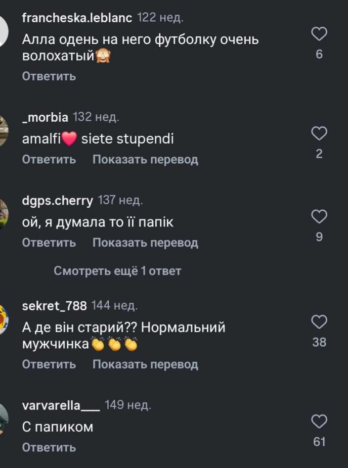 “Красивая пара. Почему многие пишут, что он старый?”, “Разве 48-летний мужчина считается старым?”, “Посмотрите на его черты лица. В молодости он был настоящим красавчиком”, “А мне нравится эта пара”,