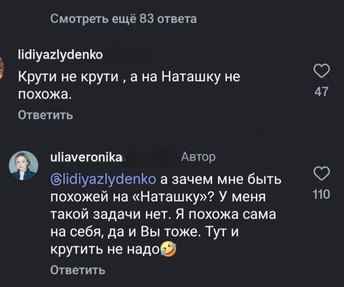 “Крути не крути, а на Наташку не похожа”, — написала одна пользовательница Сети в комментариях под новым постом Проскуряковой. “А зачем мне быть похожей на Наташку? У меня такой задачи нет. Я похожа сама на себя”,- ответила Юлия.