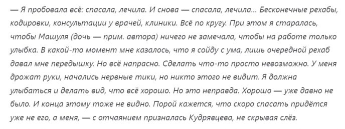 “У меня начали трястись руки. Скоро спасать придется не его, а меня. Боюсь, что Игоря скоро не станет”, — огорошила Кудрявцева поклонников своим признанием.
