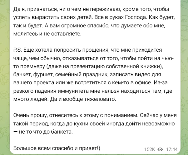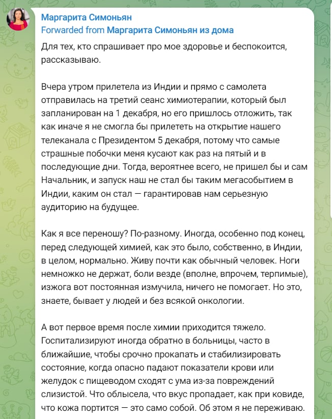 Маргарита не стала скрывать, что сегодня она мечтает лишь об одном: “Успеть вырастить своих детей”. Симоньян добавила, что, мол, “на все воля Божья”. “Первое время после химии приходится тяжело. Госпитализируют иногда обратно в больницы, часто в ближайшие, чтобы срочно прокапать и стабилизировать состояние, когда опасно падают показатели или желудок с пищеводом сходят с ума из-за повреждений слизистой. Что облысела, что вкус пропадает, что кожа портится — это само собой. Об этом я не переживаю”,- призналась Симоньян.