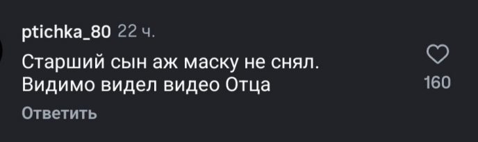 Парень, по мнению пользователей Сети, стесняется отца и не хочет лишний раз появляться с ним на людях. Саша так и не снял маску, даже для общего кадра с братьями и мамой. “Бедные дети! Им и так непросто”, “Судя по поведению Саши, ему уже показали ролик”,