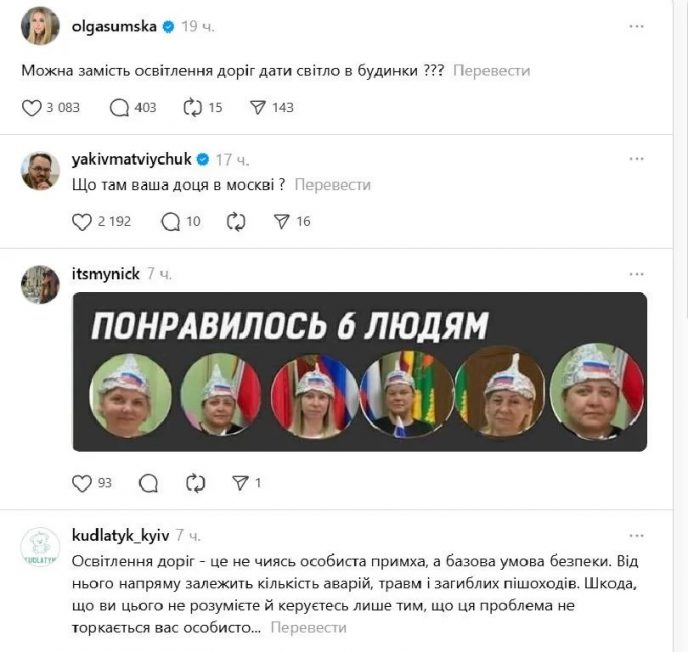 “Кто это пишет? Мама русской актрисы Антонины Паперной?”, “Госпожа Ольга, ну не позорьтесь. Вы вон тихо себе сидели, сидите», “Скажите дочери, пусть своего президента попросит”, “Жаль, что вы не понимаете, для чего нужно освещение дорог и руководствуетесь только тем, что эта проблема не касается вас лично», “Как там Тонечка поживает? У нее, наверняка, и свет есть и горячая вода. Не хотите навестить дочь?”,