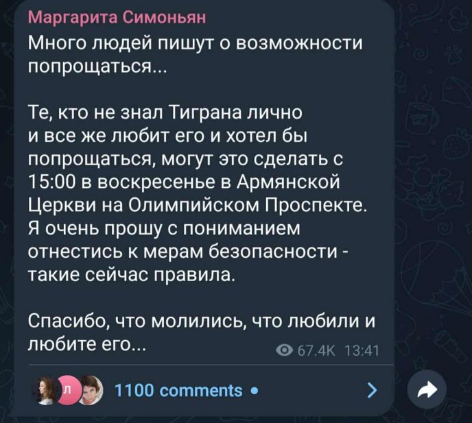 “Много людей пишут о возможности попрощаться. Те, кто не знал Тиграна лично и все же любит его и хотел бы попрощаться, могут это сделать с 15:00 в воскресенье в Армянской Церкви на Олимпийском Проспекте. Я очень прошу с пониманием отнестись к мерам безопасности — такие сейчас правила. Спасибо, что молились, что любили и любите его”,- написала уничтоженная горем Симоньян.