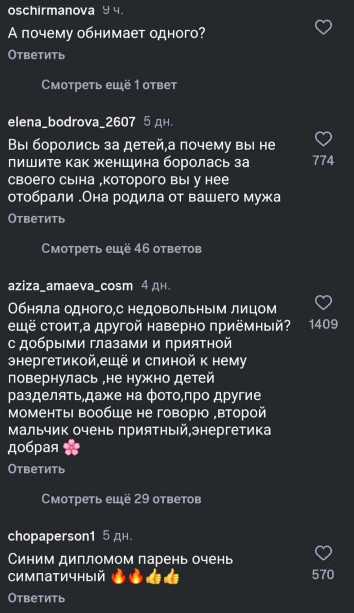 “Почему повисла на одном сыне, мамаша?”, “К неродному спиной встала. Разве так можно?”, “Понятно без слов, который из них приемный”, “Яна, вы отсудили у женщины сына, но мать ему заменить вы так и не сумели”,