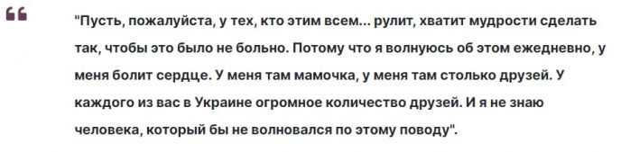«Вы все знаете, где я родилась и жила 22 года. И откуда я приехала. Пусть, пожалуйста, у тех, кто этим всем… рулит, хватит мудрости сделать так, чтобы это было не больно. Потому что я волнуюсь об этом ежедневно, у меня болит сердце. У меня там мамочка, у меня там столько друзей. У каждого из вас в Украине огромное количество друзей”,- неожиданно заявила певица.